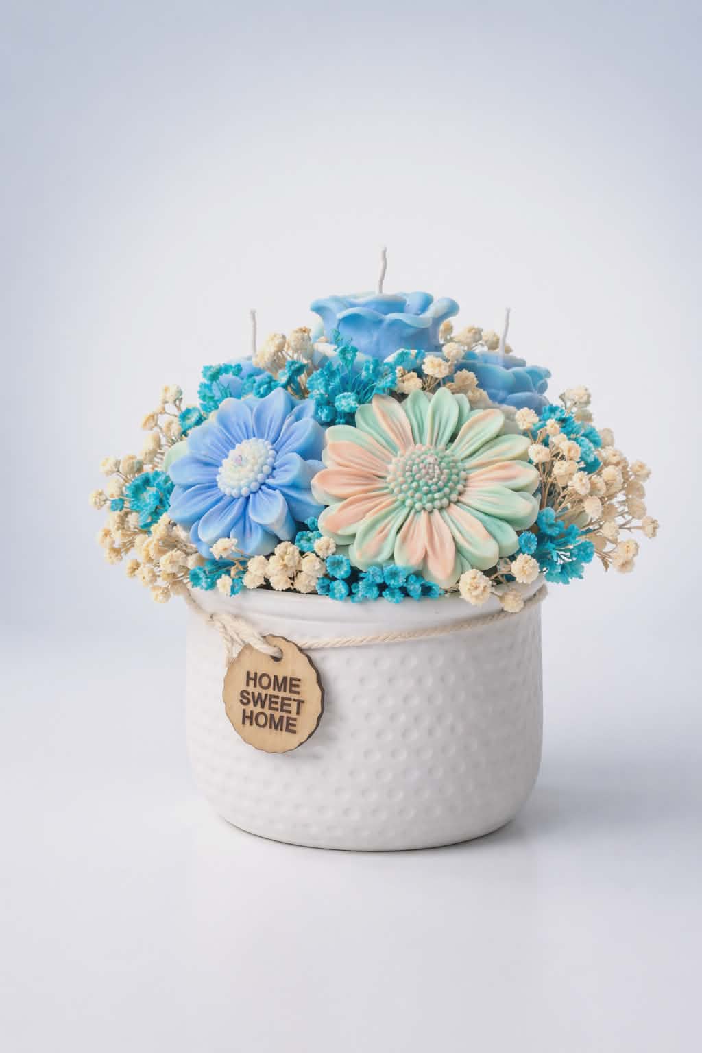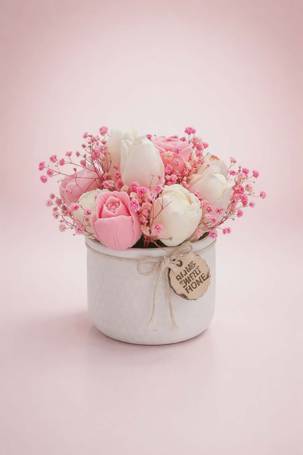 Aranjament elegant realizat din trandafiri de săpun în nuanțe delicate, așezați într-un suport decorativ rafinat. Florile au un parfum plăcut și își păstrează frumusețea mult timp, fiind perfecte atât ca decor, cât și ca un cadou special pentru persoanele dragi.