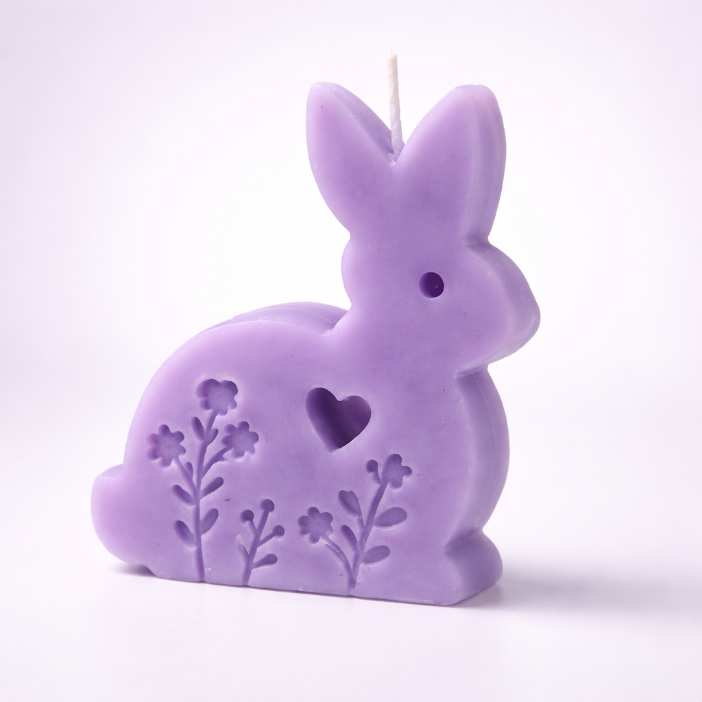 Lumânare decorativă în formă de iepuraș, realizată manual din ceară, perfectă pentru a aduce un plus de gingășie și căldură în orice colț al casei.
