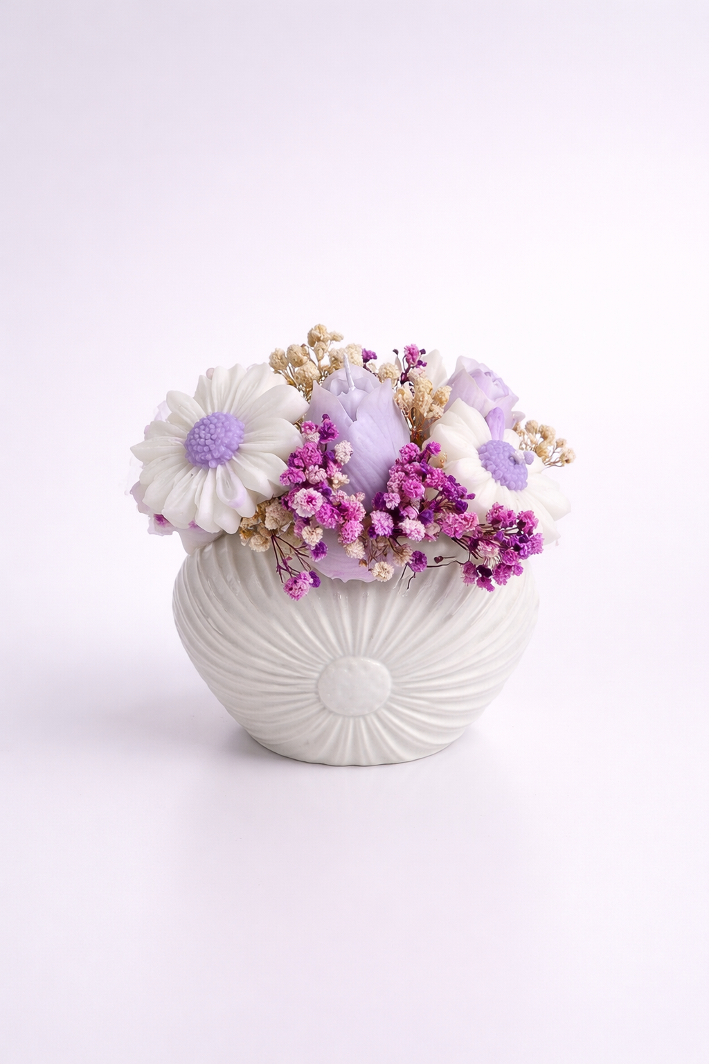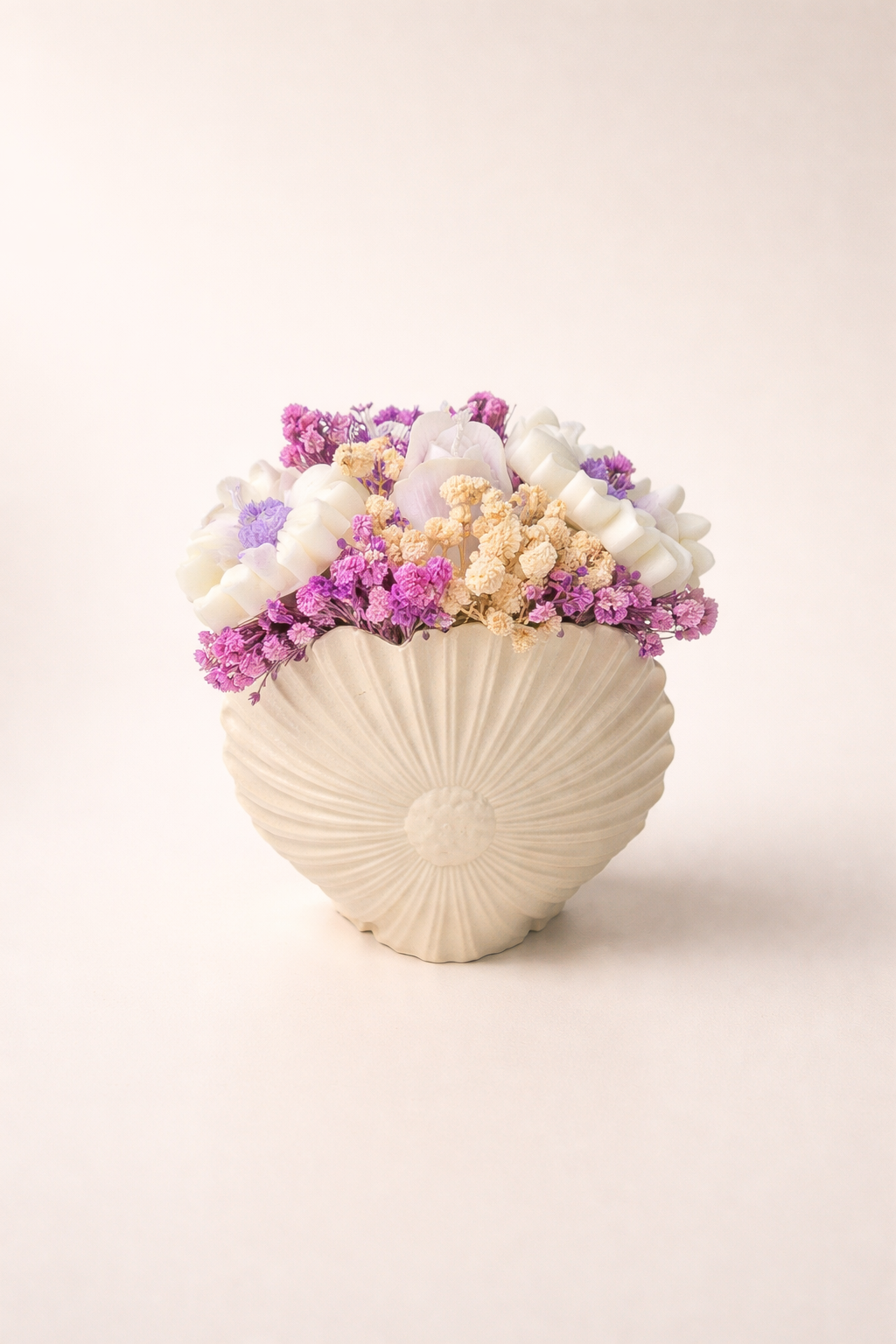 Aranjament floral delicat într-o vază decorativă din ipsos în formă de scoică – un obiect care aduce eleganță și rafinament în orice spațiu.